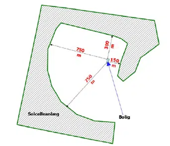 - Hvis der planlægges for opstilling af solenergianlæg på tre eller flere sider af beboelsen eller på yderligere én eller flere sider af beboelsen skal anlæg placeres, så der som udgangspunkt kan sikres en minimumsafstand på 750 meter målt fra bygninger, der er registreret som beboelse.